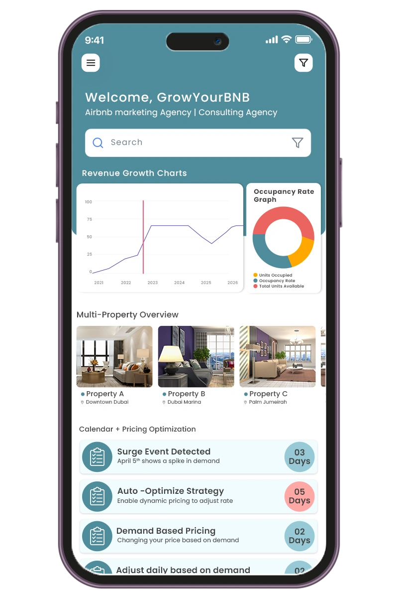 GrowYourBnb has a deep understanding of Airbnb business models, so we know exactly what drives revenue and efficiency. Our focus is always on increasing profitability, helping you get more bookings and higher occupancy. With international experience in the UK market, we bring proven, competitive systems directly to Downtown Dubai and to expanding hubs like it. We deliver practical, implementation-focused consulting, not just advice, ensuring strategies are applied and generate real results. Our scalable systems make growth efficient, helping your business expand smoothly without chaos. We don’t just help you manage better; we help you grow smarter.